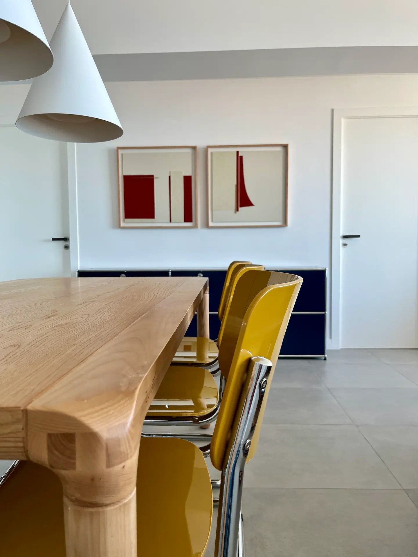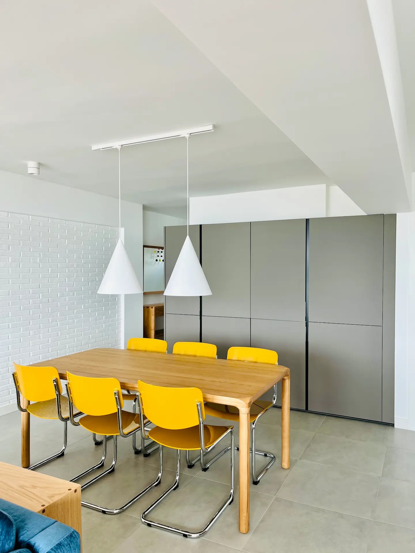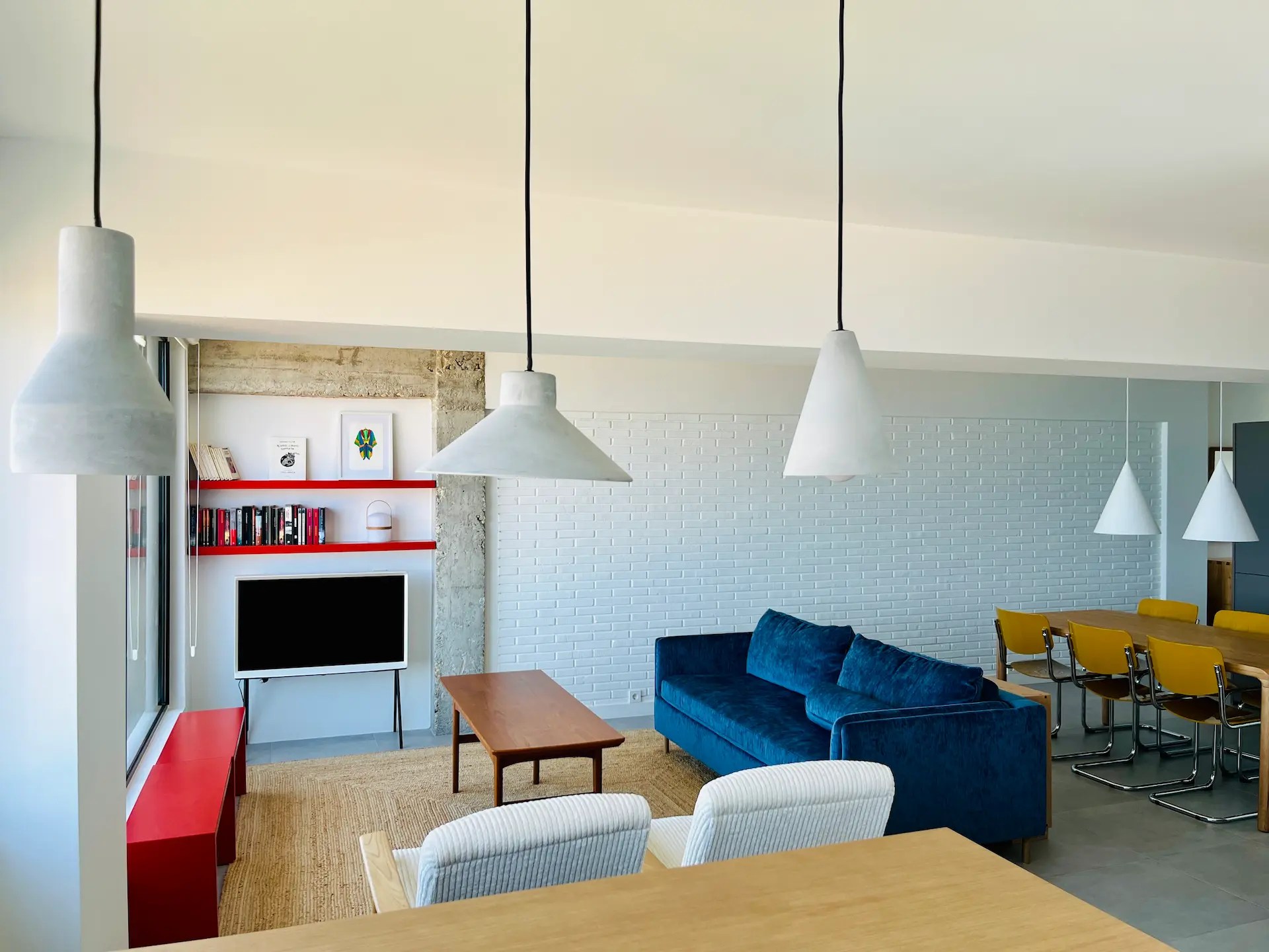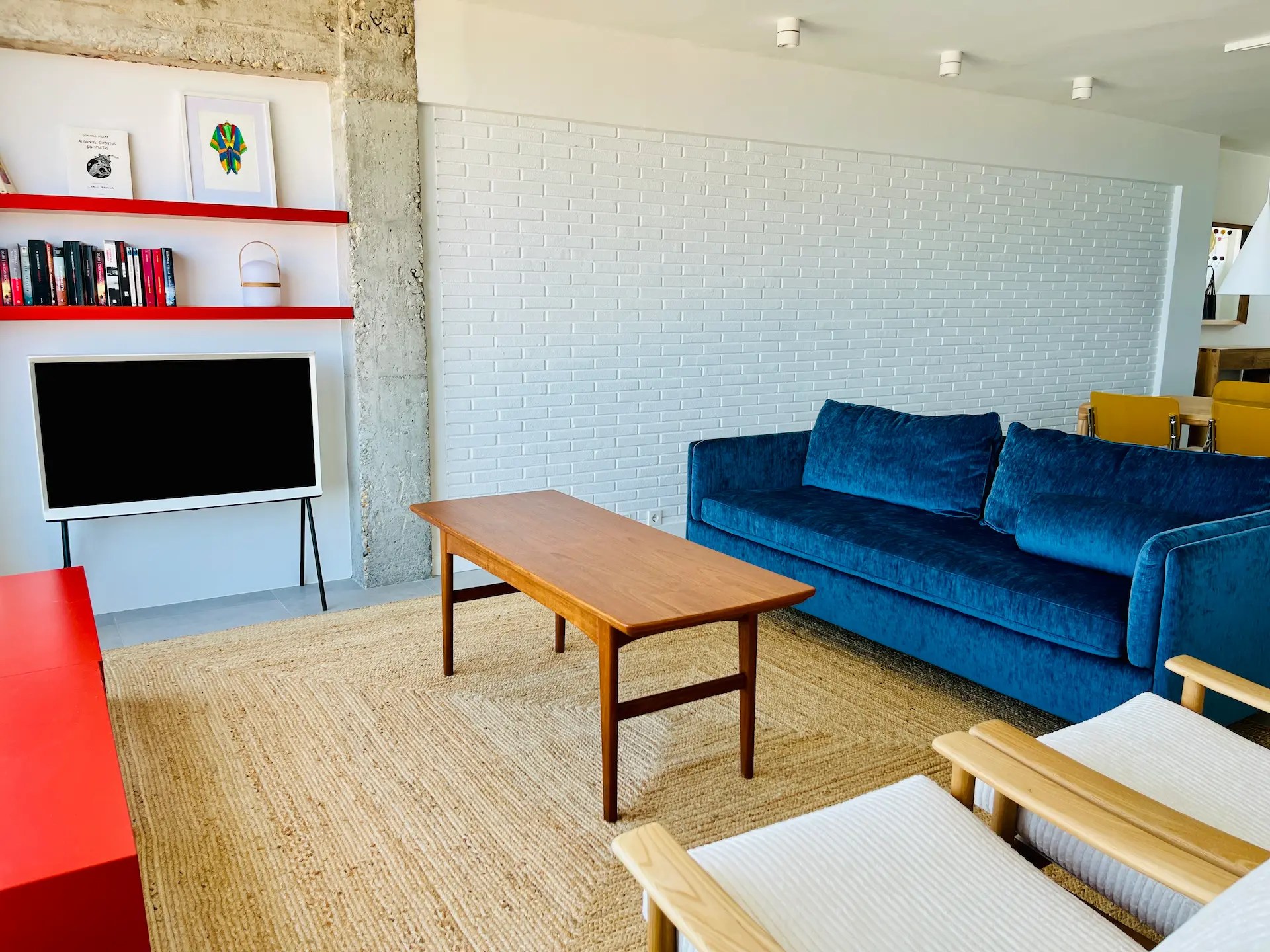 Elegimos un mobiliario de líneas sencillas pero atrevido con sus colores y el resultado es un piso moderno y alegre. La mezcla de los muebles nuevos con algunas piezas vintage como las butacas blancas o la mesa de centro le dan un toque especial y lo hacen más acogedor.