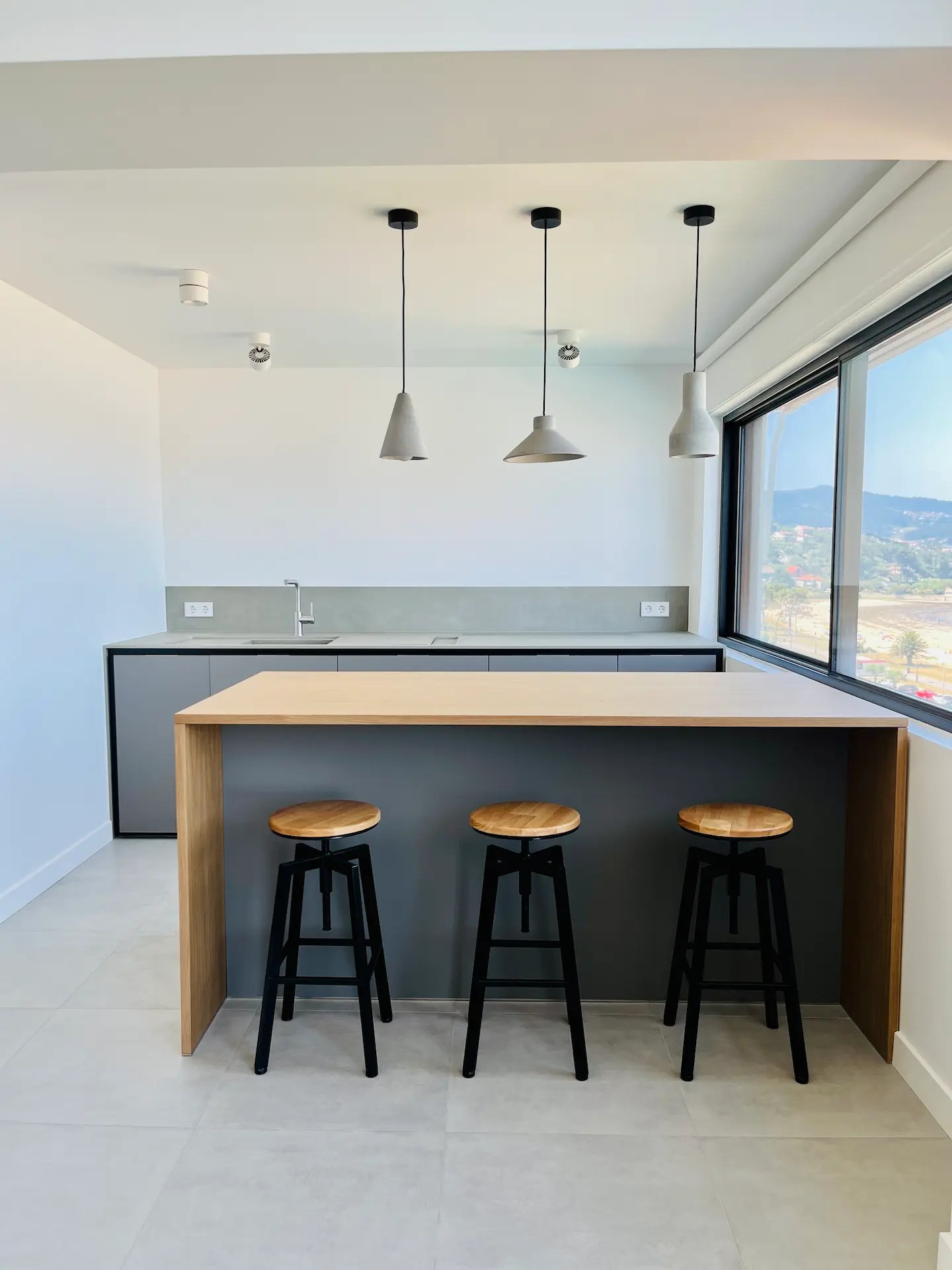 La cocina, de Mobalco Vigo, es otra gran protagonista en esta reforma. Es muy poco convencional. La superficie del antiguo dormitorio que se unió al salón no era suficiente para alojar todos los electrodomésticos necesarios, especialmente la nevera, así que decidimos ubicarla junto al comedor, donde además se consiguió una gran zona de almacenaje.