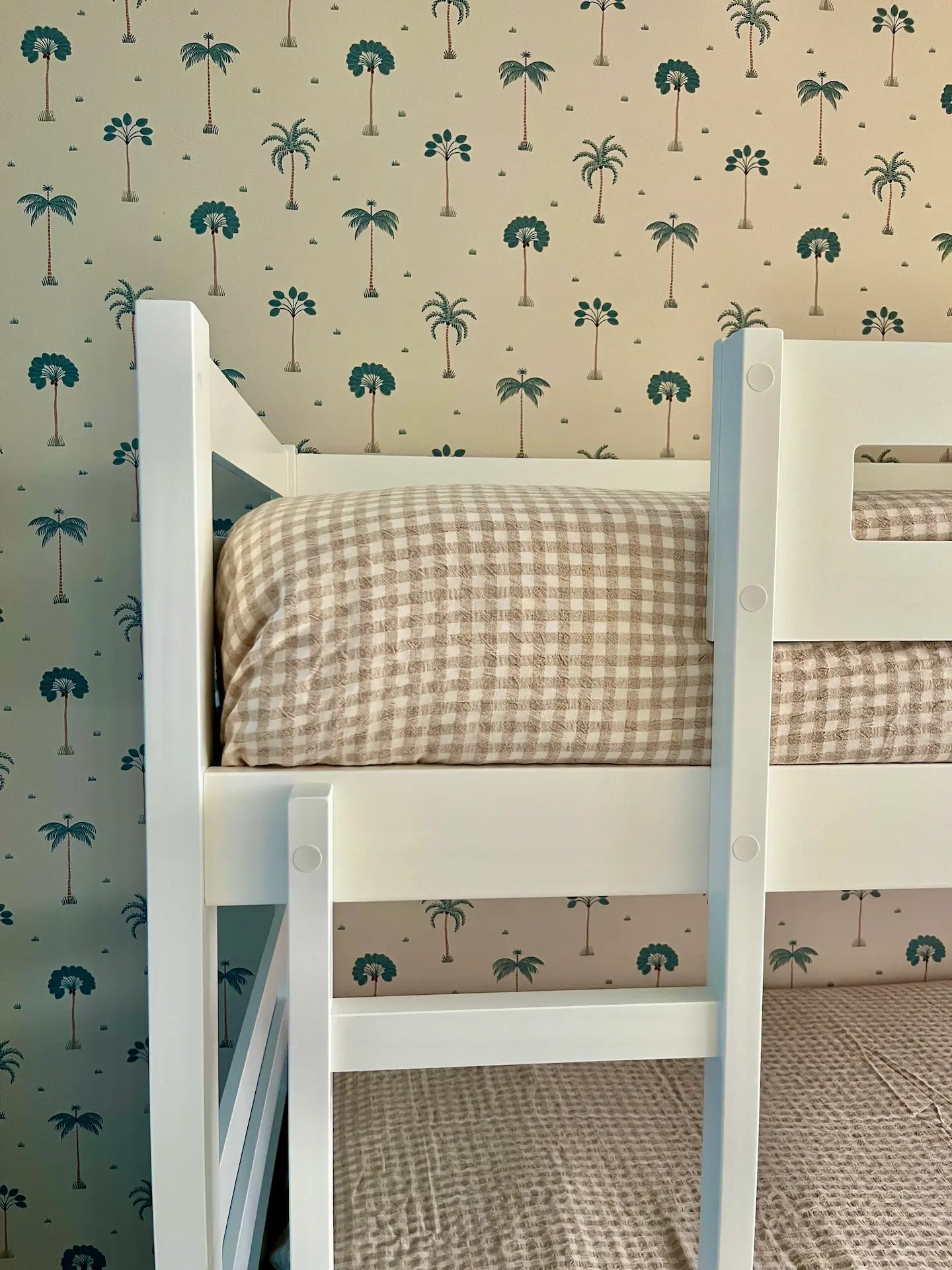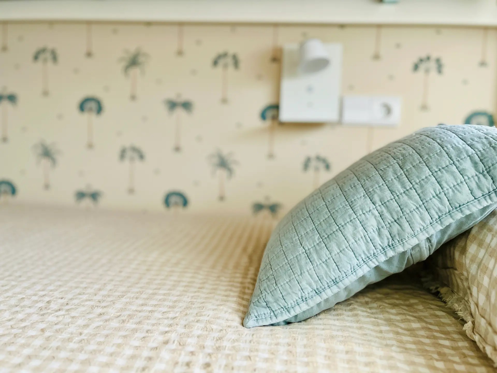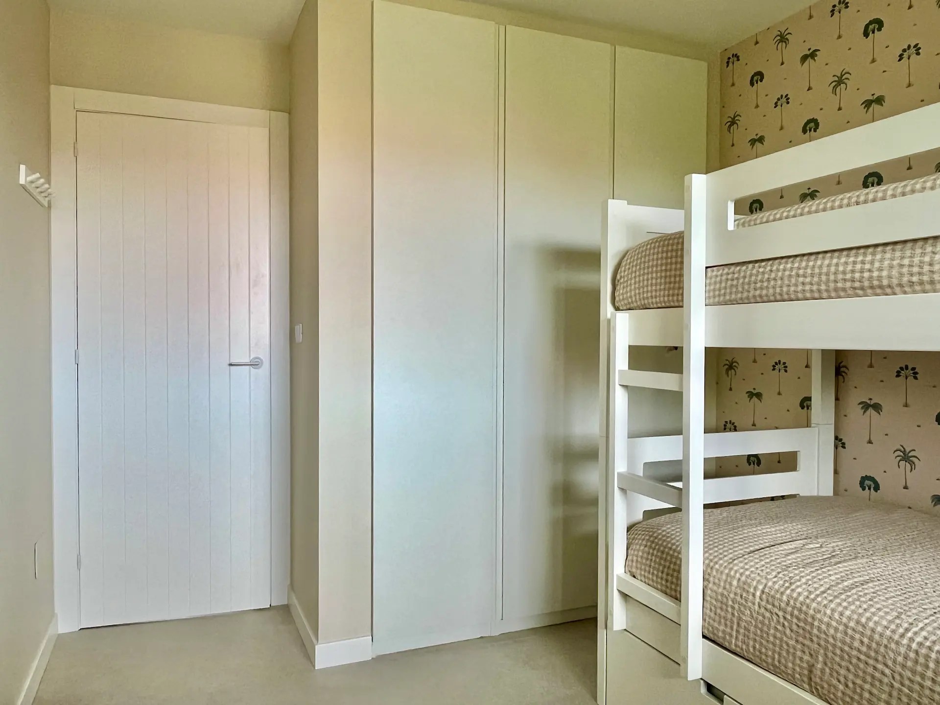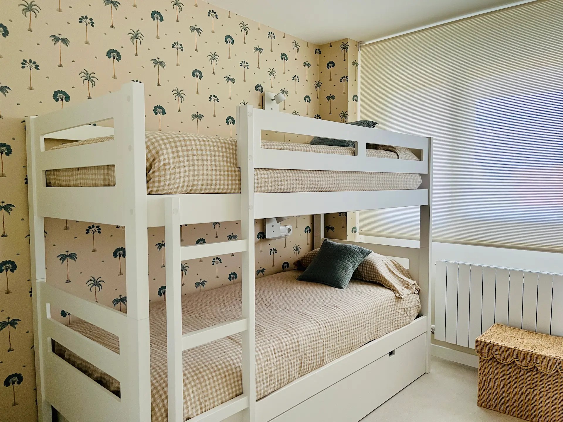 El dormitorio destinado a los niños tiene un papel muy alegre y veraniego en todos azules y verdes que sigue la línea de la decoración de la vivienda. Al necesitar 3 camas y disponer de un espacio limitado optamos por amueblarlo con una litera que además aloja una cama nido. Cada una de las camas tiene su propio aplique de pared, creando espacios lumínicamente independientes dentro del dormitorio.