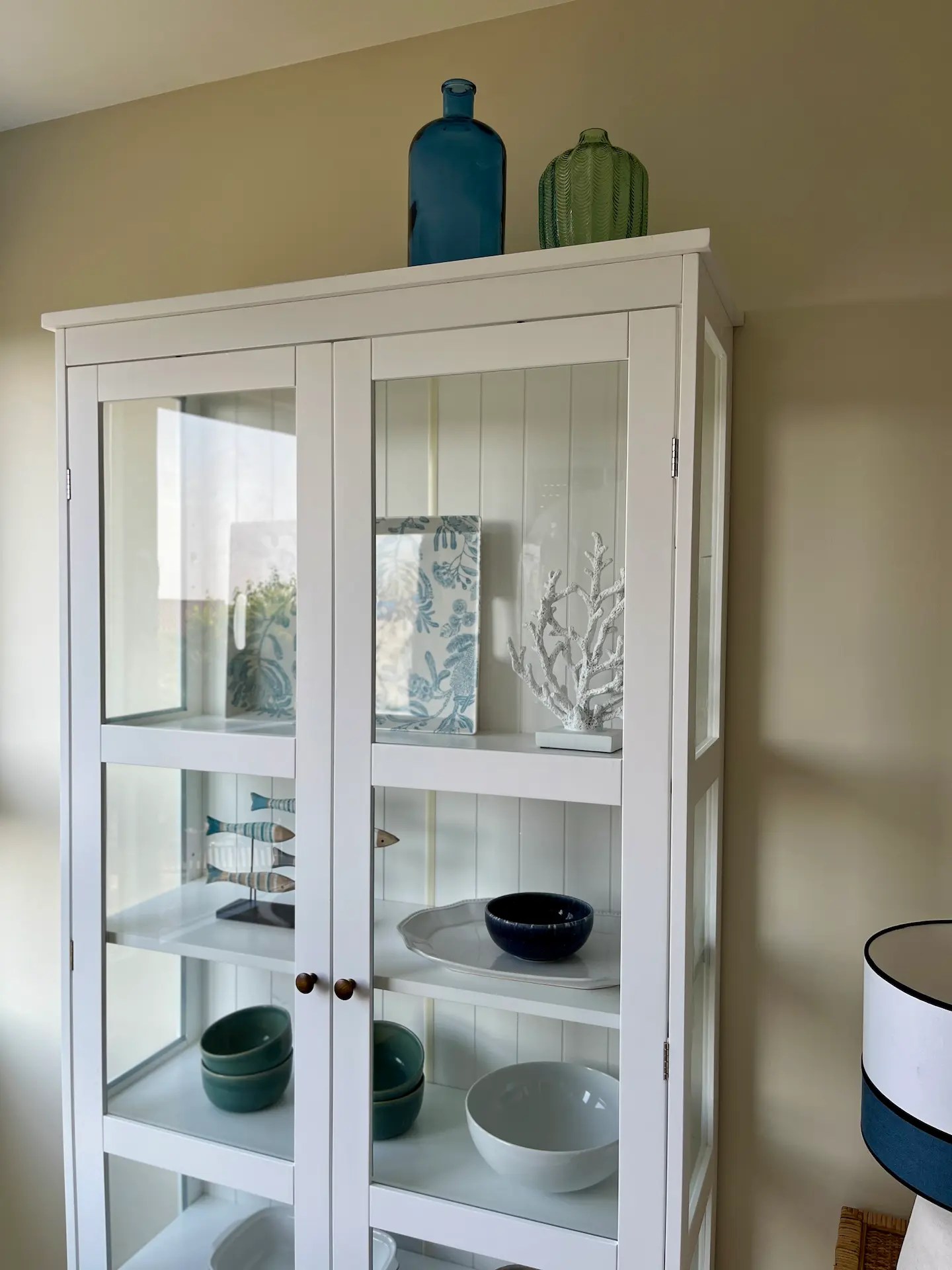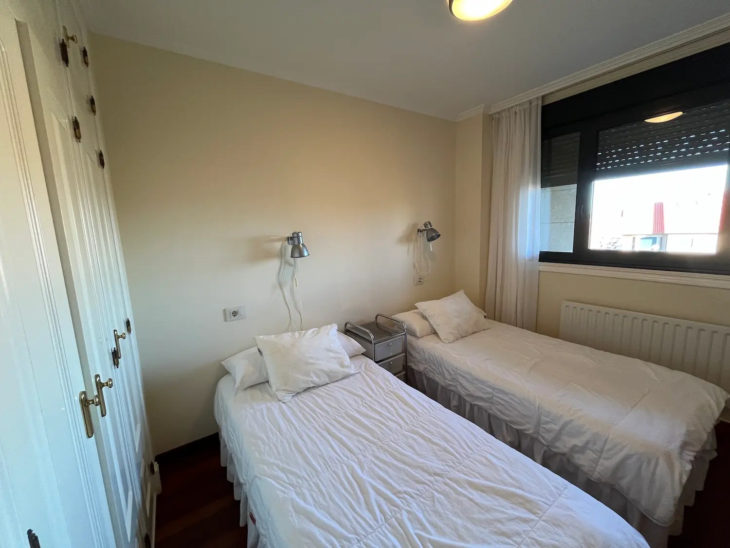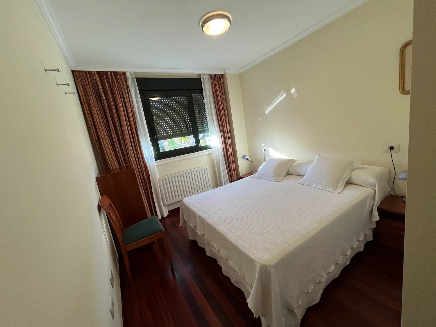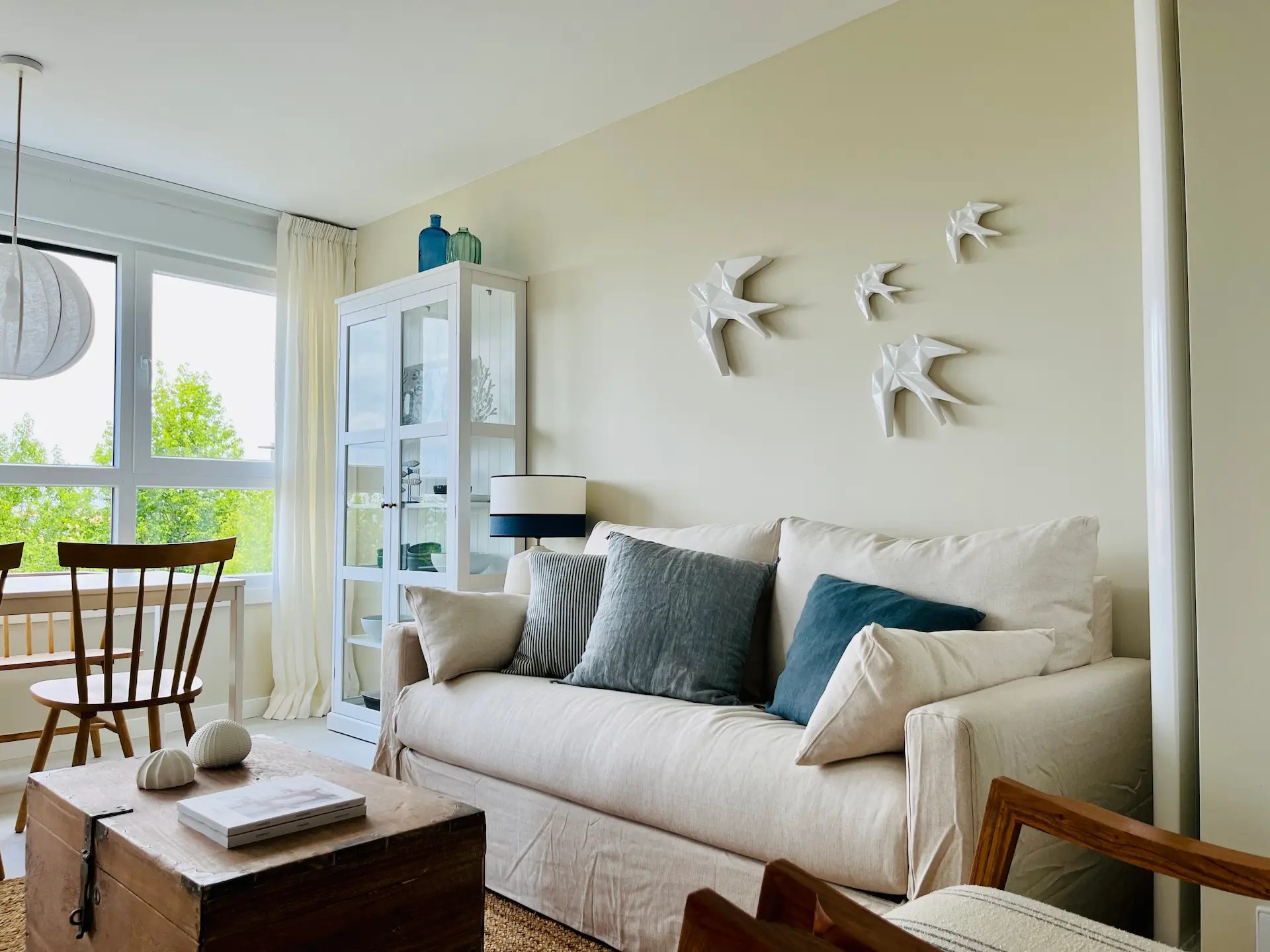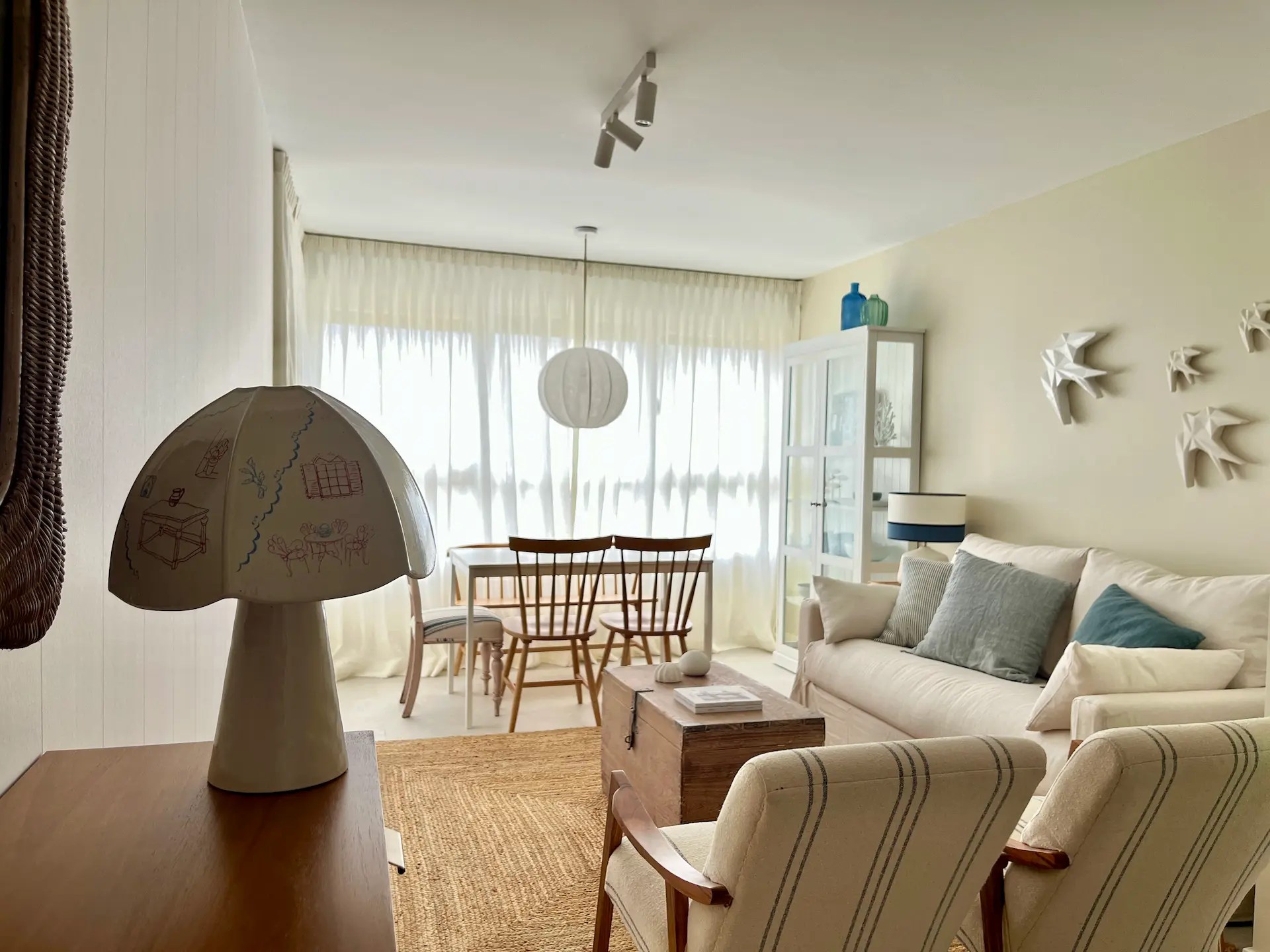 El dormitorio destinado a los niños tiene un papel muy alegre y veraniego en todos azules y verdes que sigue la línea de la decoración de la vivienda. Al necesitar 3 camas y disponer de un espacio limitado optamos por amueblarlo con una litera que además aloja una cama nido. Cada una de las camas tiene su propio aplique de pared, creando espacios lumínicamente independientes dentro del dormitorio.