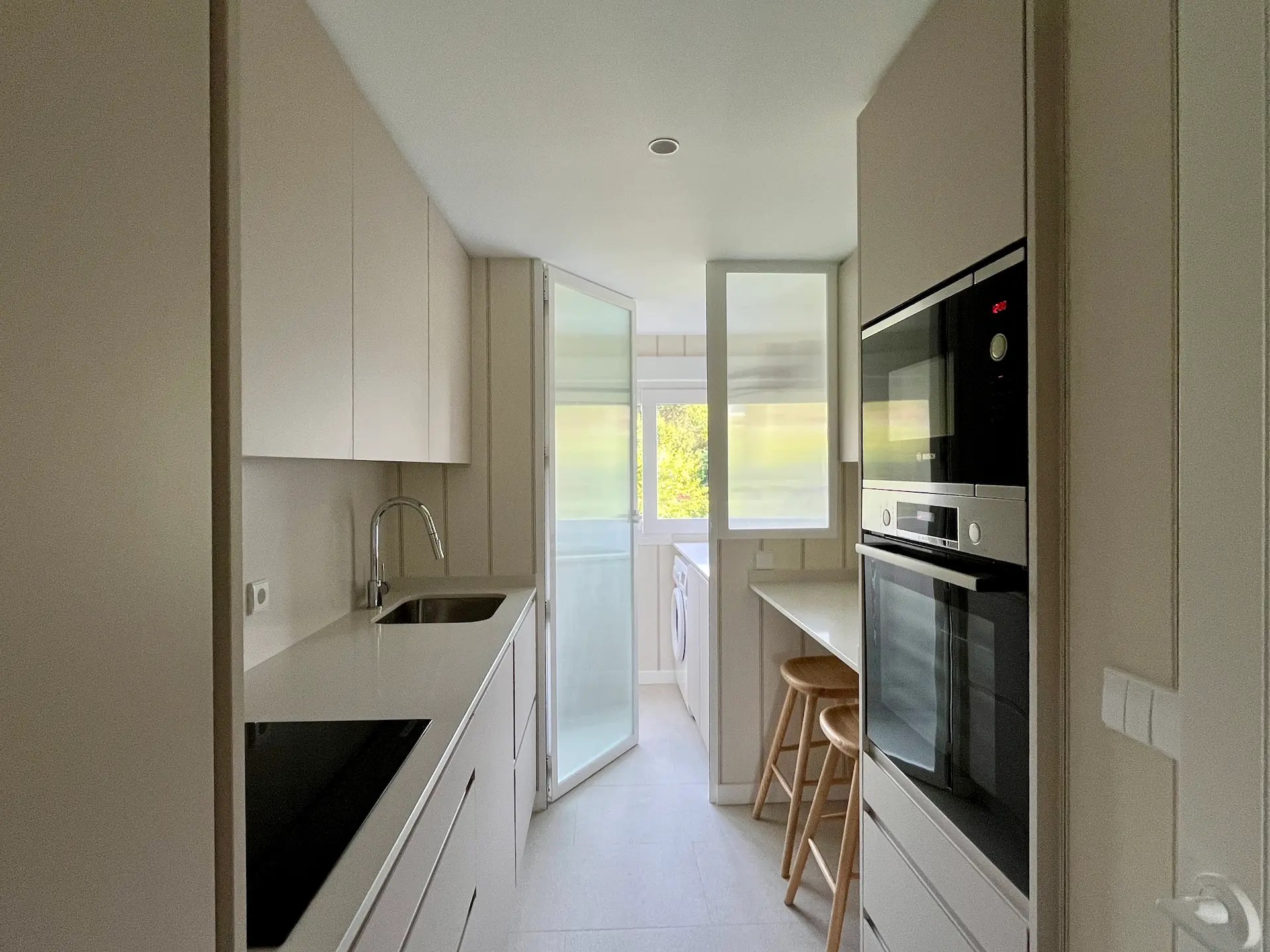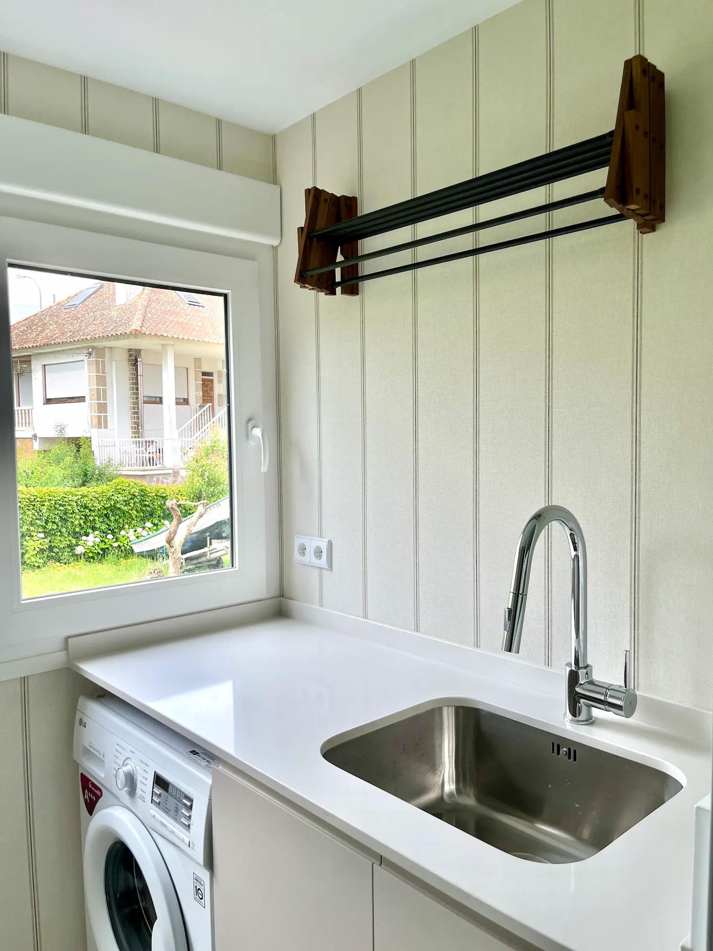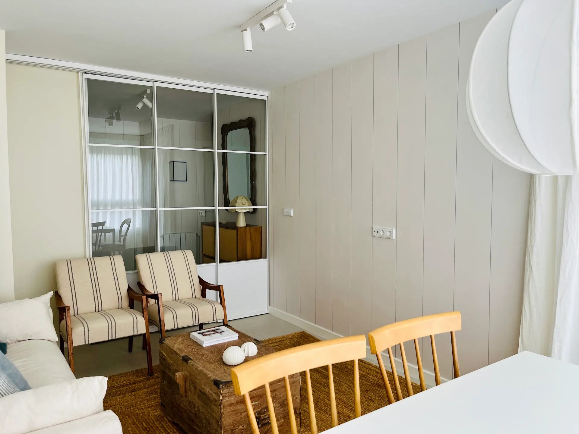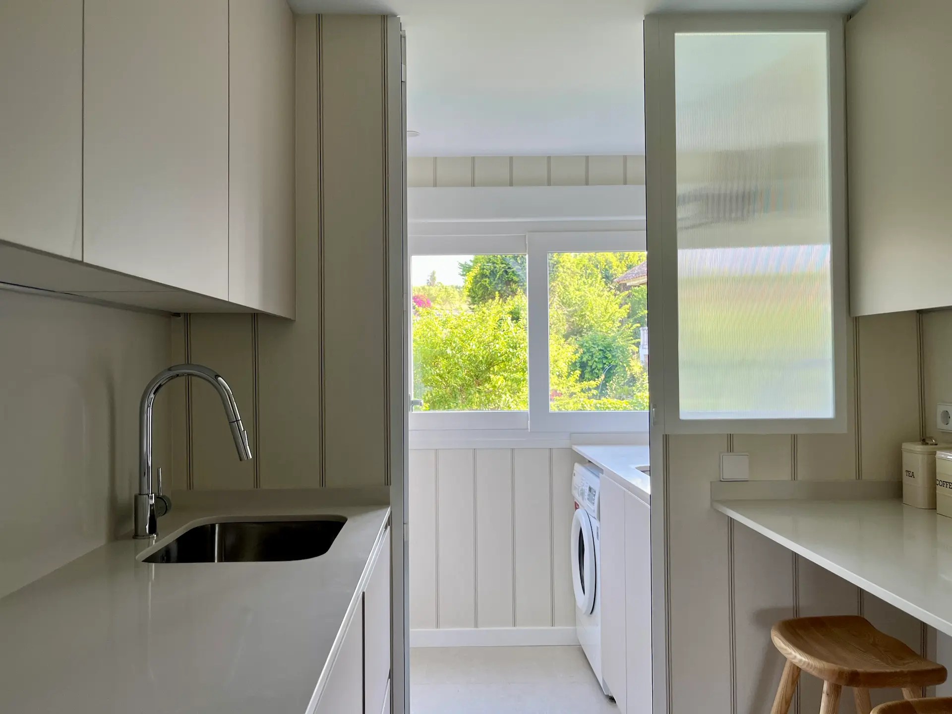 También sustituimos los armarios existentes por otros de Ikea, así como el resto de la carpintería. Las puertas, hechas a medida para este proyecto, tienen unos surcos verticales que le dan a la vivienda un aire marinero que continúa en distintas estancias como el distribuidor de entrada, el salón o la cocina y lavadero, replicando las mismas líneas verticales con los papeles elegidos para las paredes.
