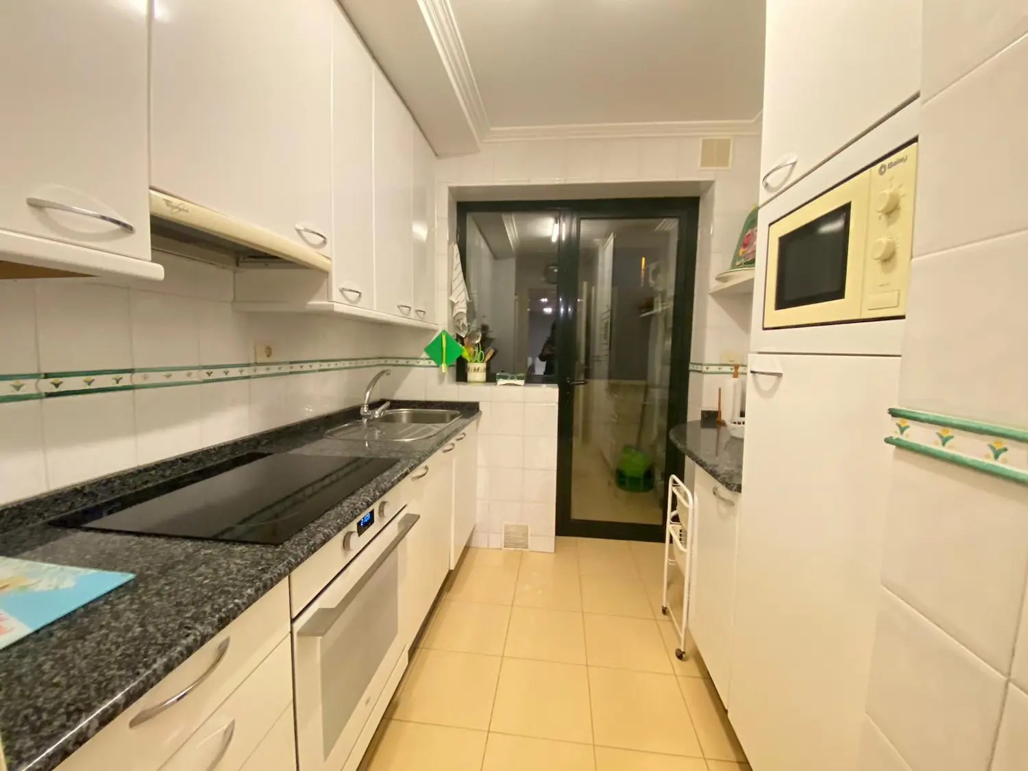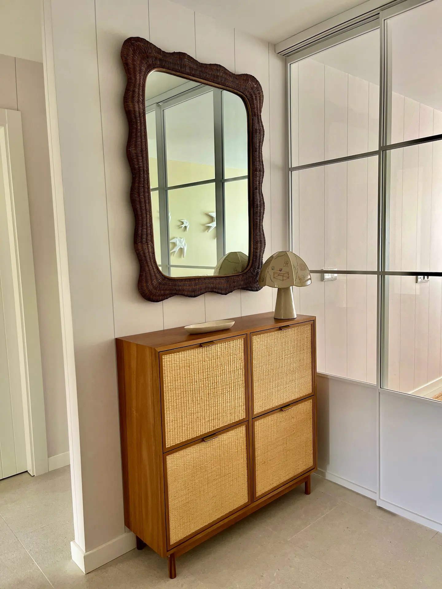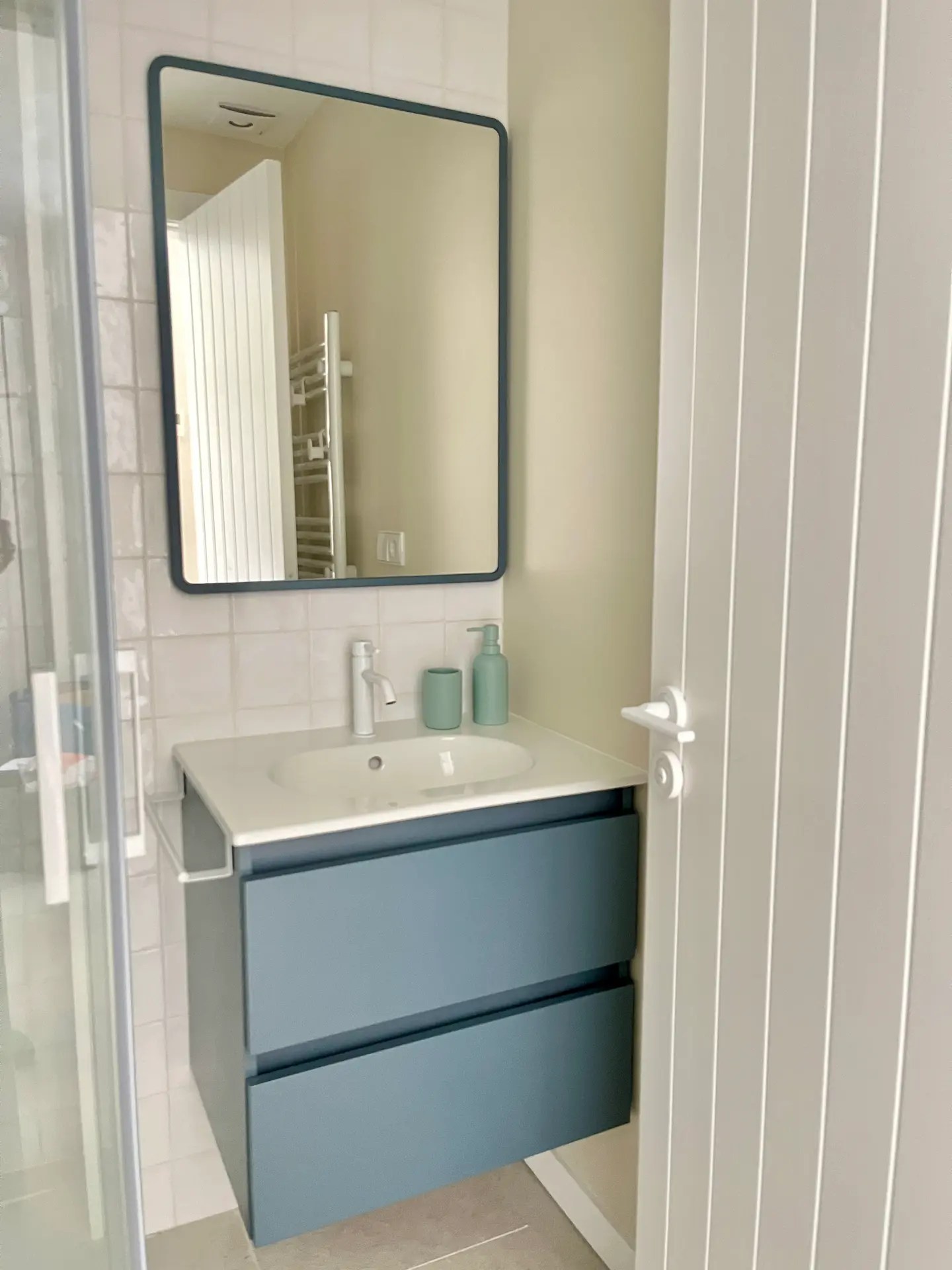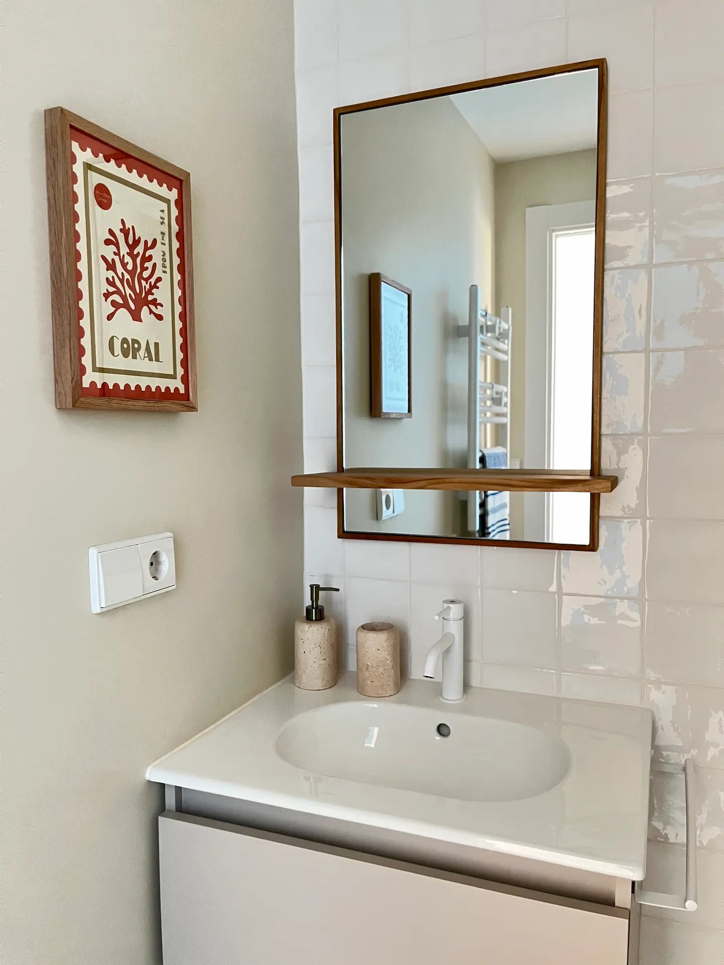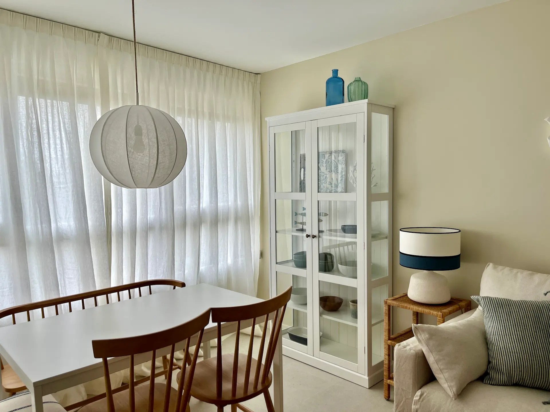 También sustituimos los armarios existentes por otros de Ikea, así como el resto de la carpintería. Las puertas, hechas a medida para este proyecto, tienen unos surcos verticales que le dan a la vivienda un aire marinero que continúa en distintas estancias como el distribuidor de entrada, el salón o la cocina y lavadero, replicando las mismas líneas verticales con los papeles elegidos para las paredes.