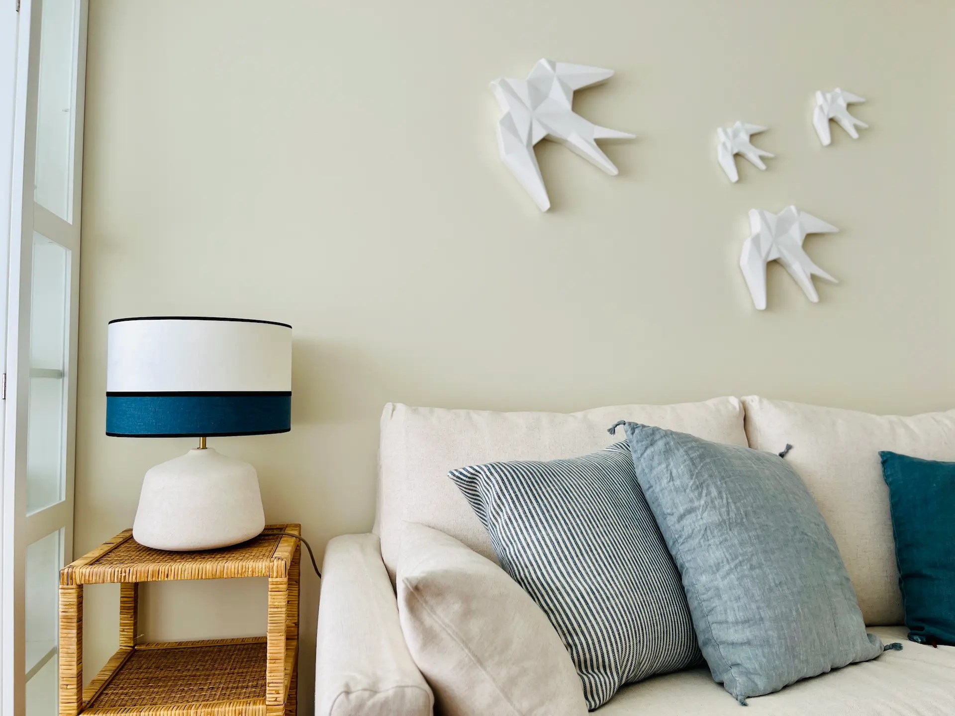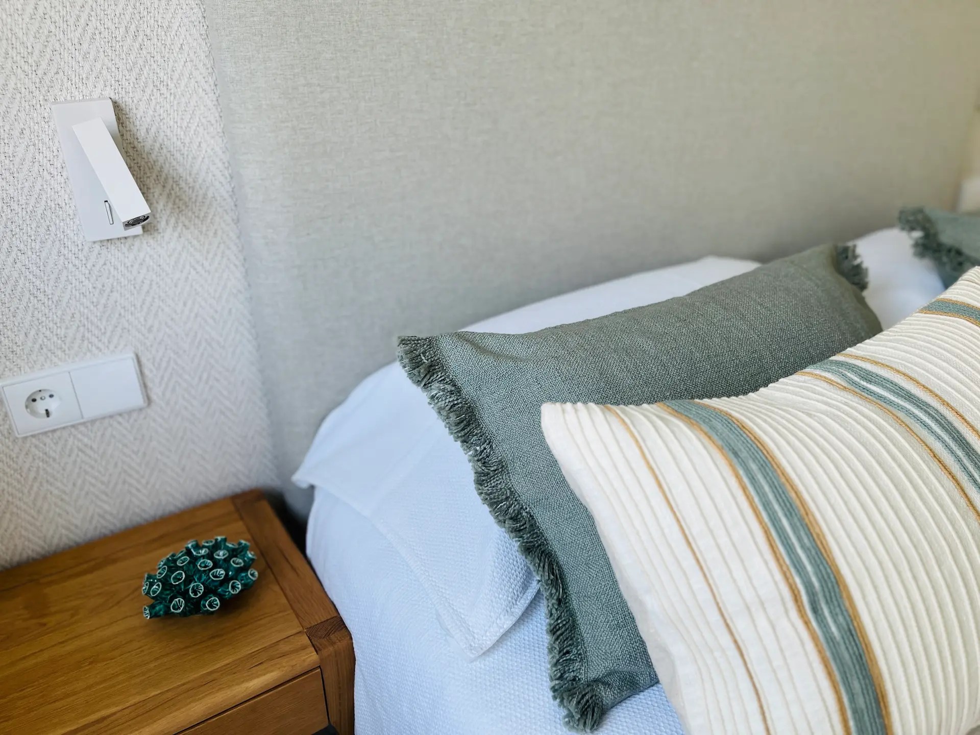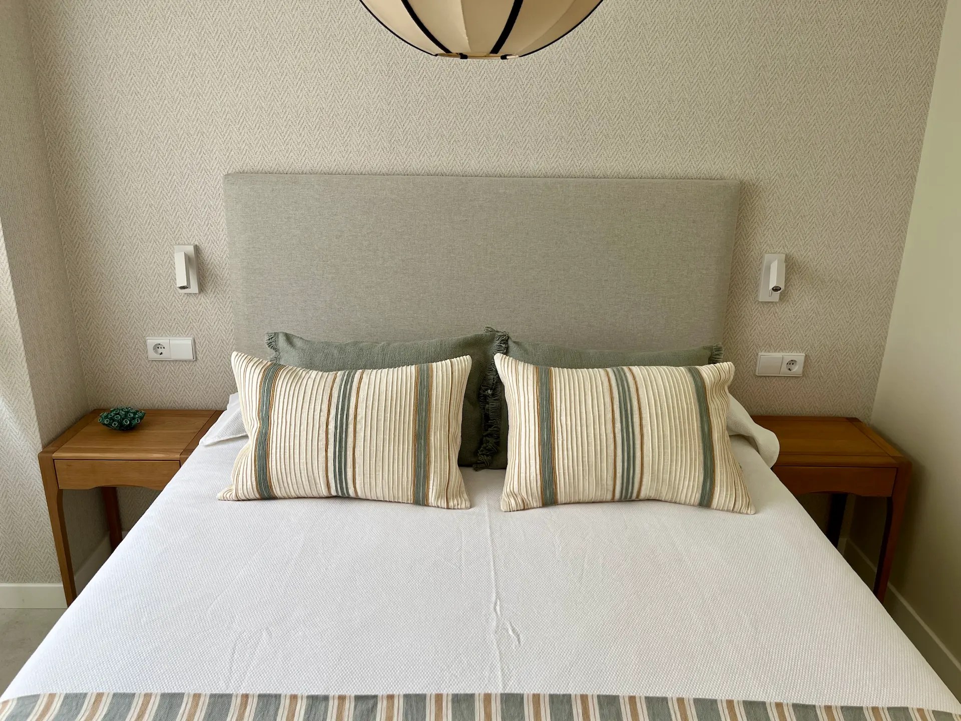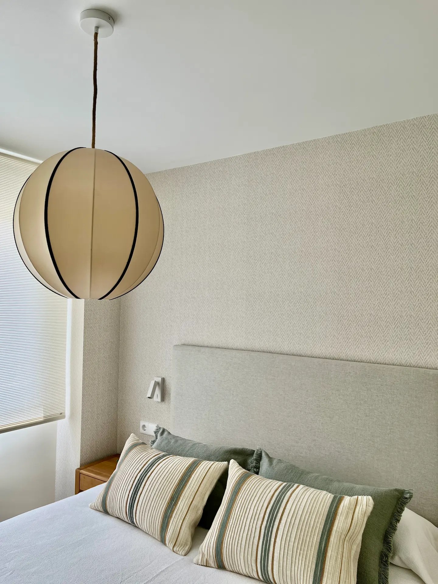 El dormitorio principal tiene tonos neutros y continúa con la estética del resto del apartamento con los textiles utilizados para vestir la cama, nuevamente con rayas y en tonos verde agua en esta ocasión.